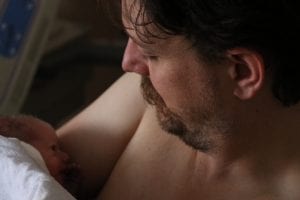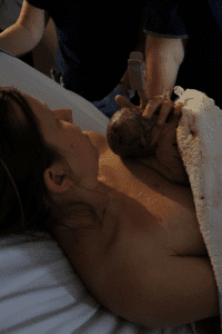 Next thing I know, I’m up on the bed. The back of the bed has been raised so that I can kneel on the bed with my arms over the top. Craig is right next to me, gently touching my arm. Another intense surge and my body again bears down accompanied by an almighty moan. Rest. I turn around and demand, “Where’s The Unicorn Ob”. “He’s on his way, don’t worry, he’ll be here any minute”, says Sharon very calmly. Cue the return of The Unicorn Ob. Upon seeing him I completely relax, because I know I’m in good hands and that me and my babies are safe. Another bearing down surge. I have my arms over the back of the bed and with the intensity of the surge the muscles in my arms and hands are stiff; I manage to consciously soften them as I let out another moan. Rest. I hear Sharon, The Unicorn Ob and Craig all telling me that I’m doing a great job (thanks guys! I am aren’t I?!). During one intense surge, I tell the room excitedly, “Ooh, I can feel the burn”. They repeat that I’m doing a great job. To be honest, I’m again not aware of time, but before too long and less than a handful of surges later Baby A is out (frank breech and 11 minutes after transition)! He is passed up through my legs and I hold him as he lets out a cry. His cord remains intact, as I turn around and recline on the bed with him on my chest. One down, one to go!