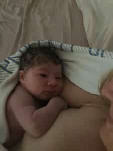 With lots of help, we got out of the bath while you wee-ed on me, and I sat on a stool to birth the placenta. Because of you suckling, I had one contraction and out it came. We clamped your cord and daddy cut it and we moved to the bed for a big cuddle.