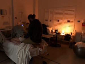 My surges became stronger over time but somehow time moved very quickly. Started on the bed moving from child’s pose to all fours, humming and breathing into my surges. I used the TENS machine which ended up being more distracting than anything – I think in hindsight it’s for the beginning stages of labour rather than more intense surges.