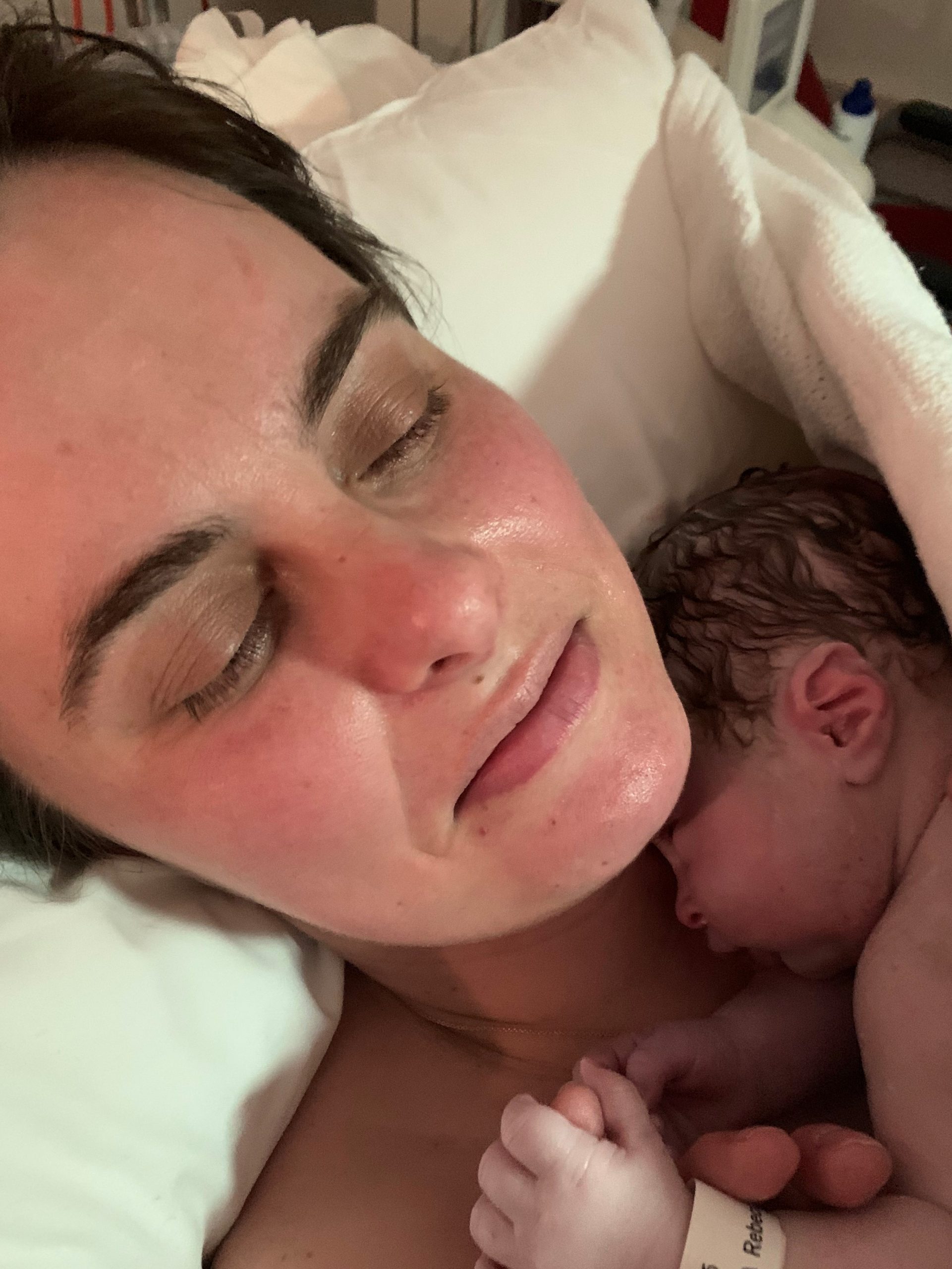 I had now been labouring for 12 hours at home until I eventually reached a point where the surged became overwhelming so the hospital advised us to come in. Once I arrived at the hospital I asked for an epidural. My partner said if I didn’t try my other pain relief preferences I’d been kicking myself so I decided to try gas. It certainly took the edge off and I felt like I could keep going.