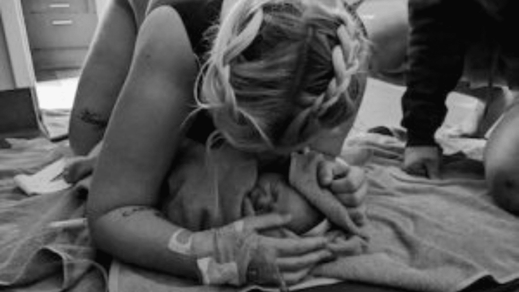 After 45 minutes of labouring on the hospital bed and crying through my surges I decided I needed to use the toilet and see if that helped but I didn’t find it comfortable at all. I quickly asked for a mat so I could get on the floor onto all fours as the surges got more intense. I then decided I needed more pain relief than the tens machine and begged for an epidural as I hit a wall in my labour. My wonderful team of midwives stalled as they offered alternatives such as gas and the shower. They knew I was close to giving birth. I attempted using gas but was frustrated and decided it wasn’t what I needed and instead vocalised my surges by grunting and screaming and releasing all of the tension through my body. After a couple of surges something changed and I became extremely erratic as I felt a burning sensation. My midwife asked me to vocalise as best I could what I was feeling, as I shouted “it burns” over and over again they prepared for the arrival of my baby.