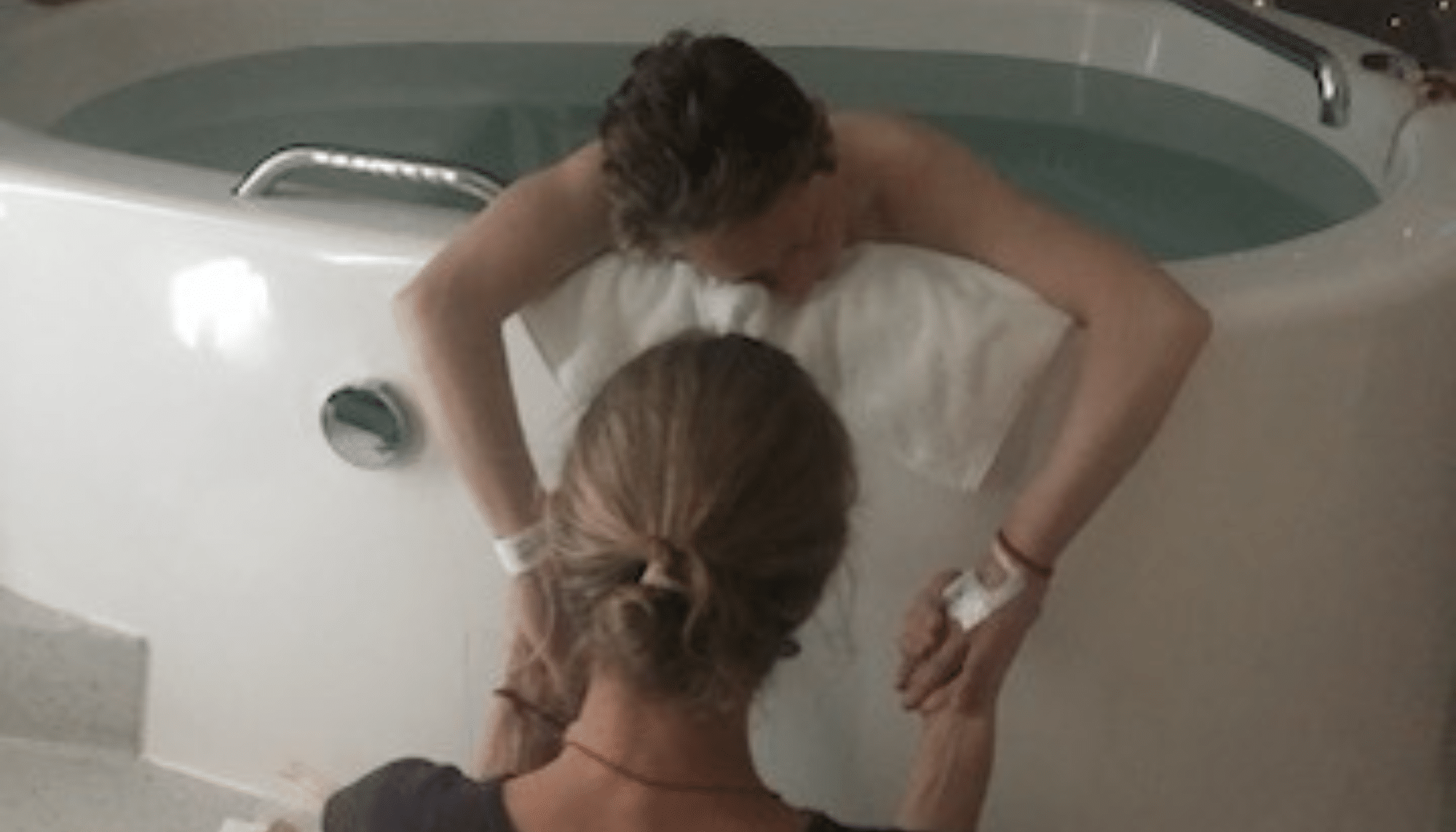 After pushing in the pool for awhile, I could tell my baby wasn’t moving down into the birth canal and I began to feel afraid. The midwife suggested I get out of the pool to change position, and my doula and friend helped me to the side of the bed, so I could stand and lean on the bed for support.