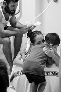 I was adamant that I wanted a water birth and was relieved as I laid weightless in the water. I listened to the “Surge of the Sea” soundtrack and was completely within myself. When the track finished and I opened my eyes I thought oh no I need to poo, I climbed out of the bath and went to the toilet. Of course it wasn’t a poo, just baby moving gently down. I decided to stay in the shower where my husband held the water over my back and he and my doula reassured me that I was doing an amazing job. I was now listening to the affirmations track and swaying my hips from side to side. A few minutes later my mindset changed to the “I can’t do this anymore”, a sign to my doula and husband that baby was now very close. I gently breathed down and his head was born, once more and his beautiful body followed. As I stood in the shower I had reached down to bring my baby up to my chest, what a beautiful moment, completed by the surprise of not knowing his gender.