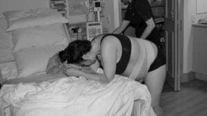 I hypnobirthed all the way through, on the fitball, in the bed, on my side, on all fours, whatever was comfy, I just had to have the monitors on. I laboured over the back of the bed for a while, that was the most comfortable.