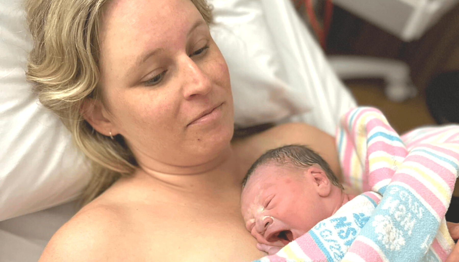 I was sitting on the bed at this point and starting to get really bad back cramps with every surge. So I wanted to keep getting up. I refused the cannula and the midwife was really rude about it and made me feel very uncomfortable. They ended up getting the dr to come in finally, who confirmed for us that baby was definitely on his way and asked very nicely if I would think about getting the antibiotics in a cannula without any cords just a through a vial. I agreed to this. We had to pause the conversation every few minutes as my surges were that close together. As soon as the dr left the room I took off my pants as I couldn’t stand them anymore! We were then moved to another birthing suite.