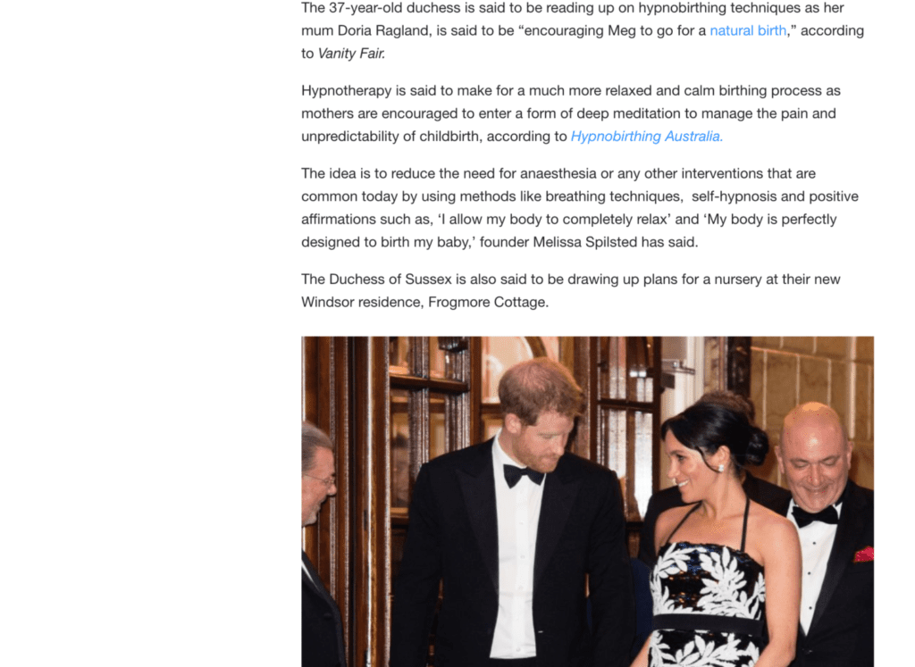 Director of Hypnobirthing Australia™ and Hypnobubs®, Melissa Spilsted, features in this article by Yahoo News about the prospect of Meghan Markle following in the steps of her sister-in-law Kate, and hypnobirthing another royal baby. 🙂