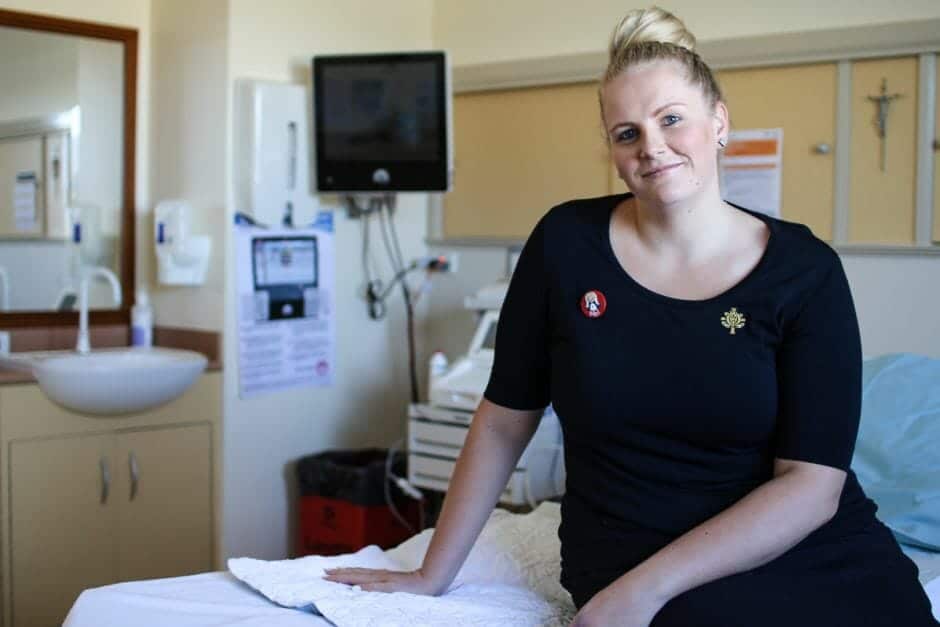 Midwife Melissa Corbett from Bendigo’s St John of God Hospital sitting on a hospital bed in a birthing suite.