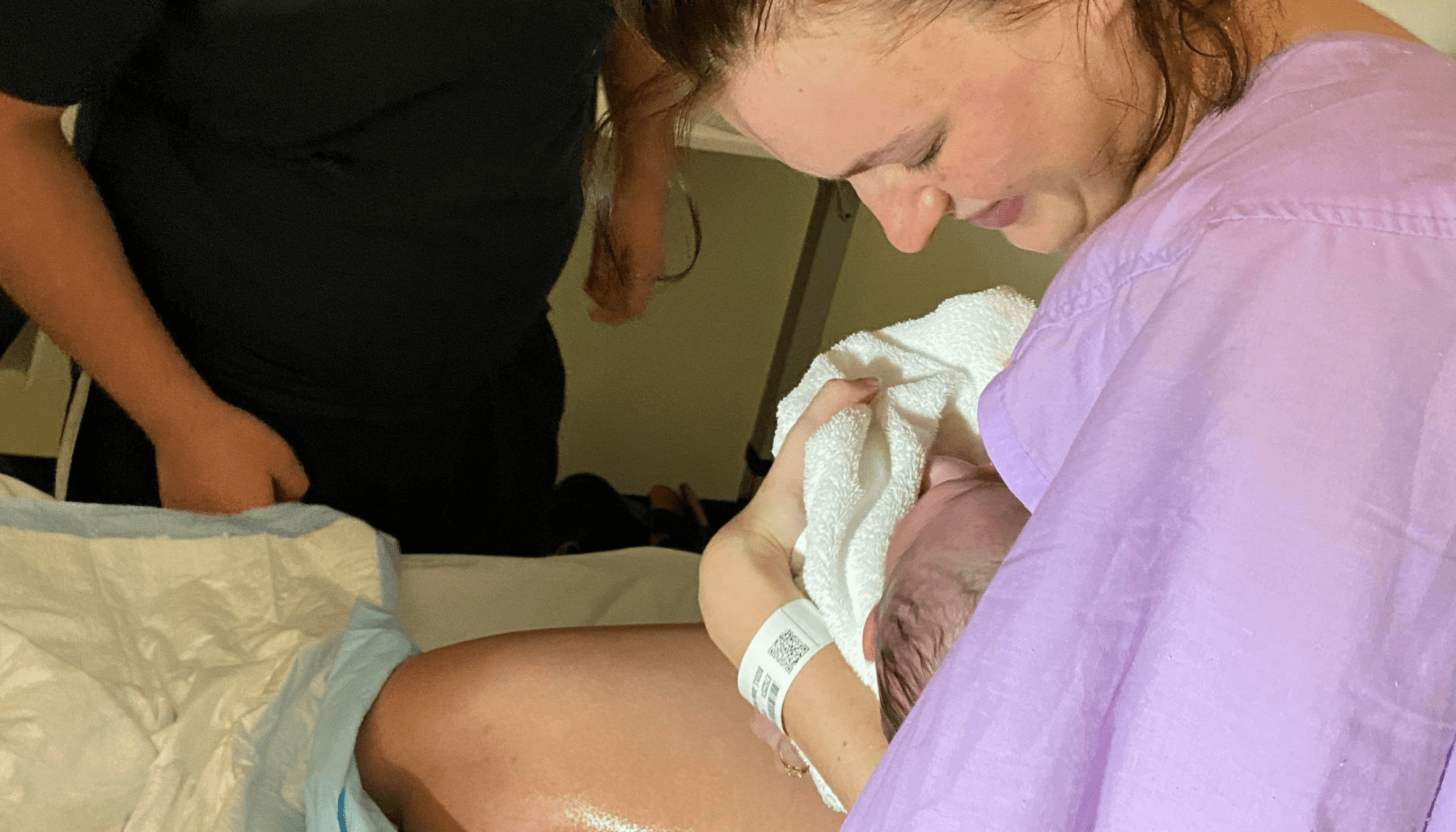 I never tracked time as I didn’t want my mind pressuring me, I assured myself there’s no set time on labour. I continued to progress in the shower, it’s true as the classes show many women tend to moan during the contractions my body took over and I moaned through each contraction except I was starting to involuntarily push, we checked again in the shower as I was still uneasy on if I was ready to. I never had the urge with my daughter I was coached. The midwife was more than happy for me to deliver in the shower, she checked and there was a lip of cervix at the front. So a few more contractions I hopped out to see if we could assist the bearing down was taking over me. I hopped on the bed upright leaning over with my partners hand, he popped on some music and with the first bearing down contraction the midwife was able to slip the cervix out of the way.